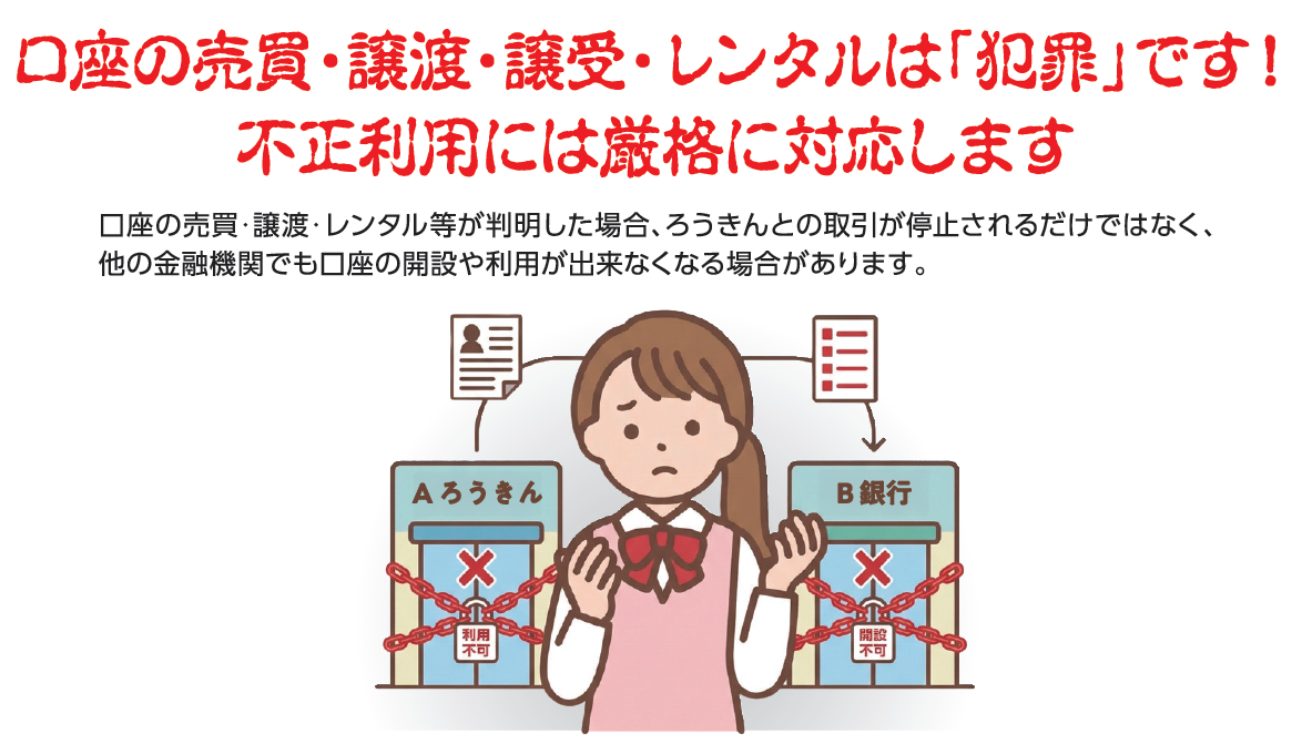 ●口座の売買・譲渡が判明した場合、口座を解約します。さらに将来にわたって銀行取引ができなくなるおそれがあります。
