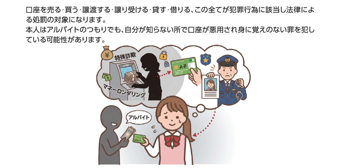 ●売買・譲渡された口座は振り込め詐欺、ネットショッピング詐欺など、さまざまな犯罪で悪用される危険があります。