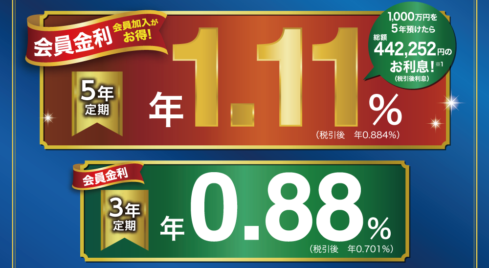 | (1)会員の方 3年定期:年0.88%(税引後 年0.701%) 5年定期:年1.11%(税引後 年0.884%) (2)一般の方 3年定期:年0.68%(税引後 年0.541%) 5年定期:年0.91%(税引後 年0.725%) |