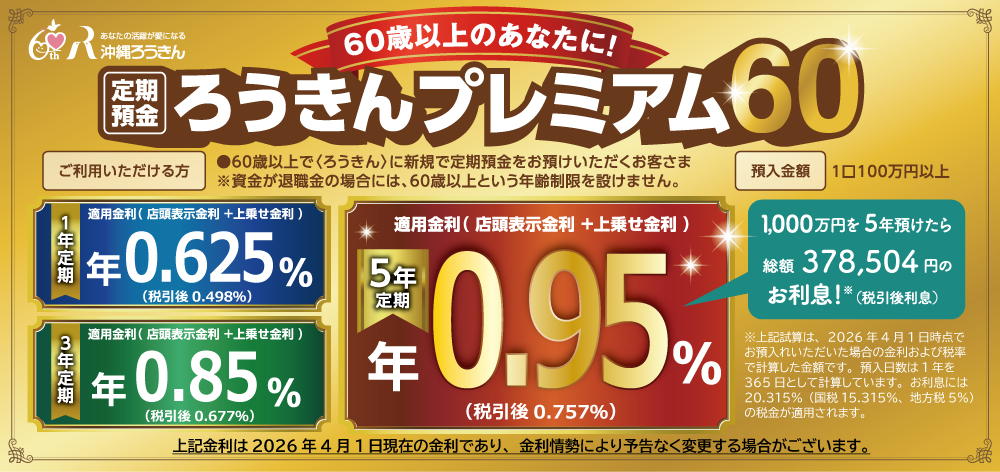 | 60歳以上で〈ろうきん〉に新規で定期預金をお預けいただくお客さま ※資金が退職金の場合には、60歳以上という年齢制限は設けません。 |